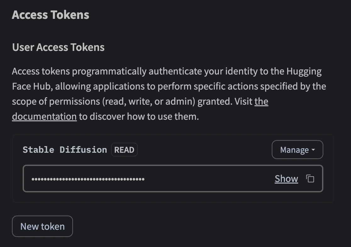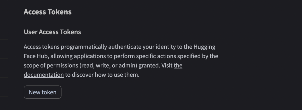 # ②Hugging Faceへのアクセストークンをトークン変数に格納 MyTOKEN="<HugginFace HubのサイトでコピーしたAccess Tokenをここに入れる>"