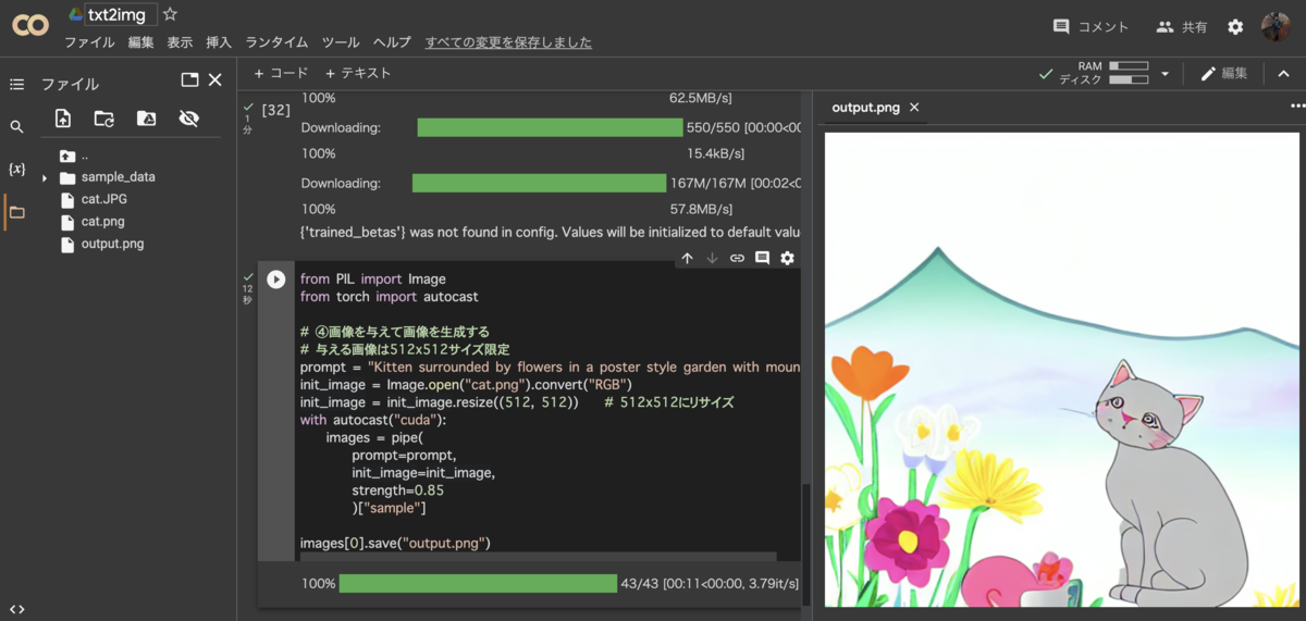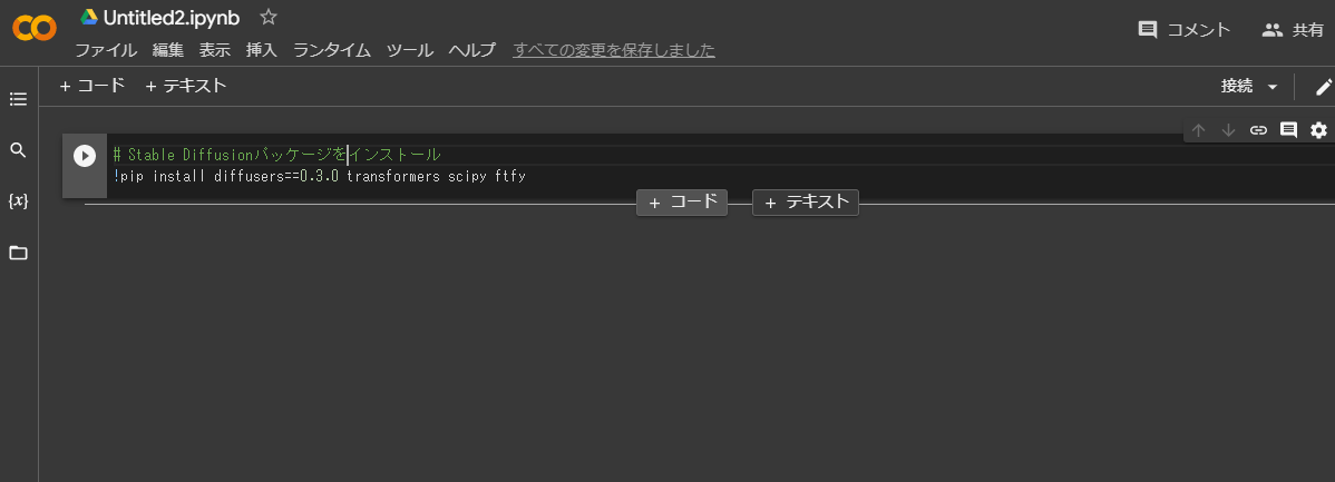 # ①Stable Diffusionパッケージをインストール # img2img対応したバージョンをインストールするためにGitHubのリポジトリを指定 !pip install transformers scipy ftfy !pip install git+https://github.com/huggingface/diffusers.git