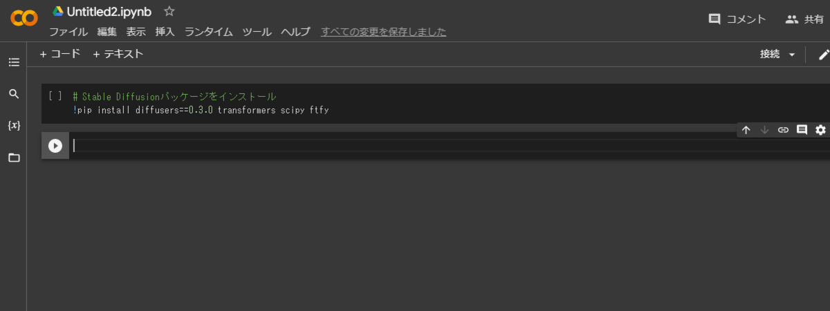 コード入力だが、プログラムの機能(ブロック)毎にコードを分けて入力すると、各ブロック単位で個別に実行が可能になる。今回で言えば④のコードを実行する度にAI画像が生成される訳だが、もし全コードを一つのブロックに入れてしまうと、①や②の部分で時間や負荷がかかる無駄が生じてしまう。これを実行単位の切り分けで回避出来る訳だ。またデバッグにも便利だ。