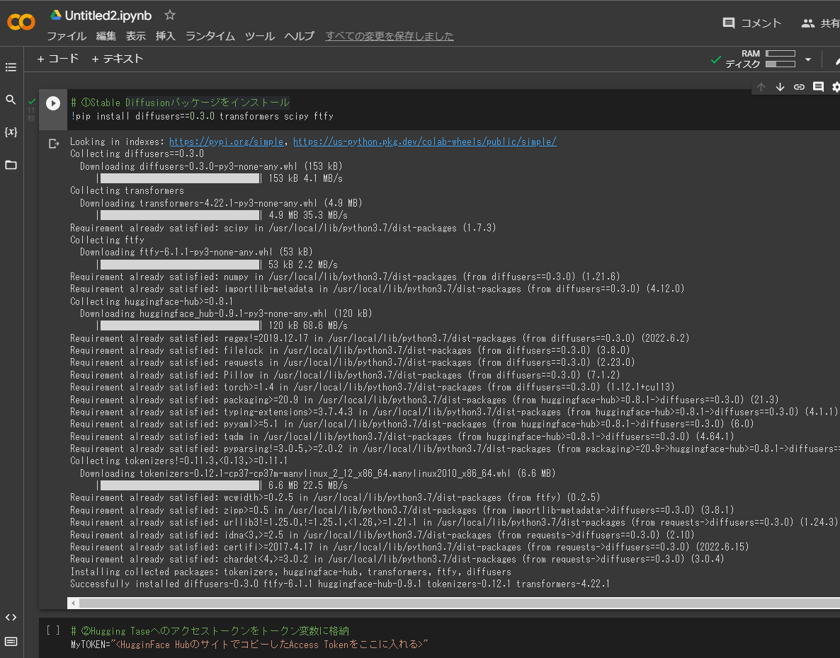 # ①Stable Diffusionパッケージをインストール !pip install diffusers==0.3.0 transformers scipy ftfy