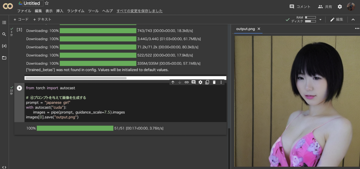 同じく4番目のコードブロックに下記をコピペする。プロンプトは「japanese girl」、日本の少女にしたが、何でも構わない。