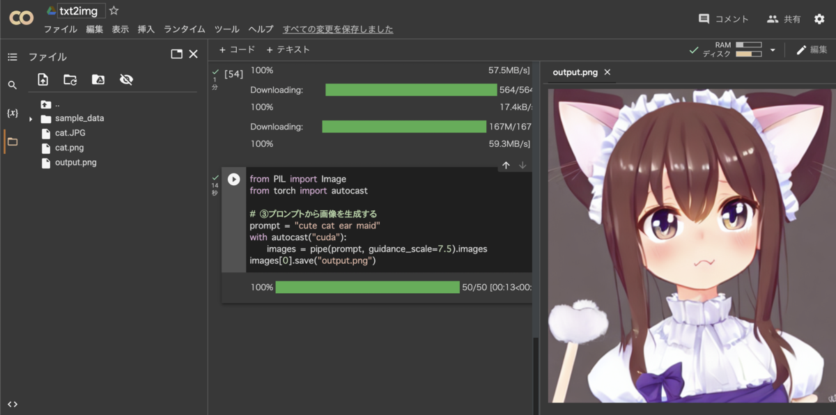 実例1のコードに対して利用したモデルを指定するだけで、Stable Diffusion標準モデル以外のWaifuやTrinartなどのモデルが使える。プロンプトは「cute cat ear maid」に変更している。