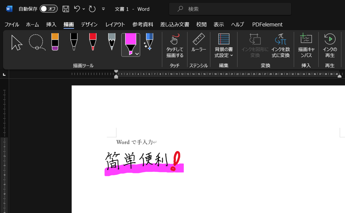 まずはWordで試してみる。メニューの「描画」をクリックすると、下の図の様にペンなどが現れるので、色や太さ、種類を選んで自由に書ける。また「インクの再生」を押すと、書いた順に自動再生されるので例えばプレゼンテーションに使えるだろう。