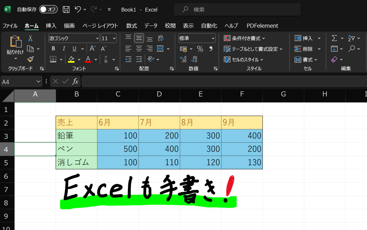 Excelも同様である。なお画面にペンを持った手を近づけるだけで自動で「描画」メニューになる。またExcelは画面の拡大縮小が二本指で簡単に行えるので、手書きノートアプリ同様に細かな字も自由に書けるし、ホワイトボードアプリの様に描画エリアも自由に広がる(※Excelのセル配置の制約上、A1地点から左及び上方向にはエリアは広がらないが、右および下方向には自由に広がる)。正直手書きツールはExcelだけでも十分では?と感じる程優れている。