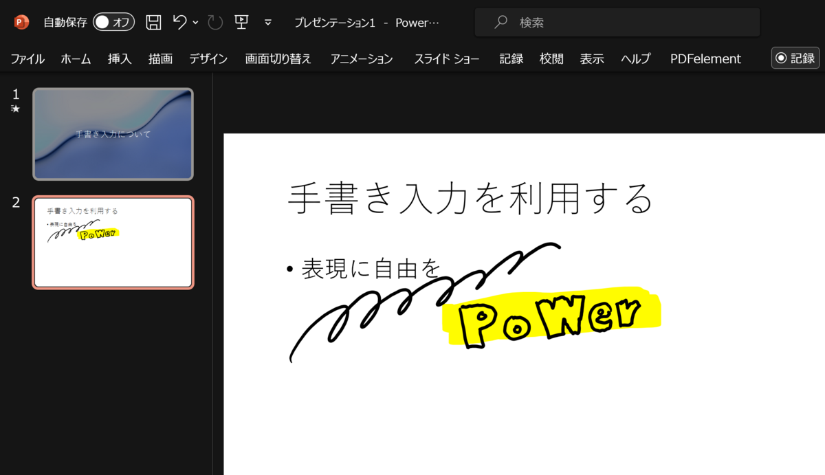PowerPointも同様。画面の拡大縮小も同様に行えるので小さい字の書き込みも容易だが、これも手書きノートアプリ同様に描画スペースは固定される(欠点ではなくそういう仕様)。